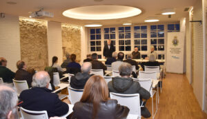 En el acto inaugural participaron, además del propio autor, el presidente de nuestro Colegio, Luciano Vidán, y el director, productor y guionista Ángel de la Cruz —ganador de cuatro premios Goya—. El doctor Vidán dio la bienvenida a los asistentes al Colegio, «que es la casa de todos, porque nada de lo que sucede en la sociedad es ajeno a los médicos». Por otro lado, añadió, «hoy es un día muy especial, porque llevamos tiempo intentando que Gogue protagonizara una exposición en el Colegio». Se trata de «un artista integral que es capaz de reflejar todos los días, en una viñeta, lo más relevante de lo que está sucediendo en el mundo, y hacerlo con humor. Es muy agradable empezar el día con el optimismo de su trabajo. Eso ayuda tanto a las personas en su día a día como lo hacemos los médicos en otras facetas».